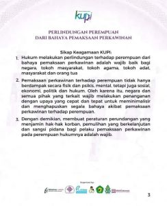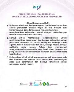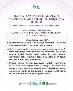 Sikap Keagamaan dari hasil rekomendari Kongres Ulama Perempuan Indonesia 2 (KUPI-2) menegaskan bahwa semua pihak bertanggung jawab untuk melindungi perempuan dari segala bentuk kekerasan atas nama agama. Hal itu disampaikan Fatum Abubakar, saat membacakan hasil musyawarah keagamaan KUPI-2 terkait pembahasan ‘Peminggiran Perempuan dalam Menjaga NKRI dari Bahaya Kekerasan Atas Nama Agama’, di Pondok Pesantren Hasyim Asy’ari, Bangsri, Jepara, Jawa Tengah, Sabtu (26/11).