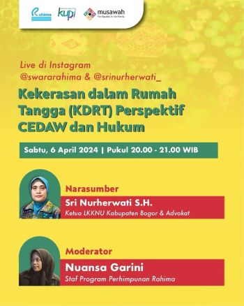 Live Instagram kelima, yang terakhir pada malam ini, 6 April 2024 pukul 20.00-21.00 WIB akan membahas “Kekerasandalam Rumah Tangga (KDRT) Perspektif CEDAW dan Hukum”. Diskusi kali ini bersama narasumber Ibu Sri Nurherwati (Ketua LKKNU Bogor dan Advokat) yang akan dimoderatori oleh Nuansa Garini (Staff Program Rahima). Silakan bergabung nanti malam melalui instagram @swararahima dan @srinurherwati_