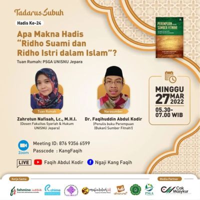 | Tuan Rumah | : | Zahrotun Nafisah, Lc. M.H.I (Dosen Fakultas Syari'ah dan Hukum UNISNU Jepara) |