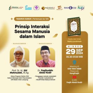 | Narasumber | : | Prof. Dr. Hj. Siti Mahmudah, M.Ag. (Ketua Program Doktor S3 Hukum Keluarga Islam Pascasarjana UIN Raden Intan Lampung) |