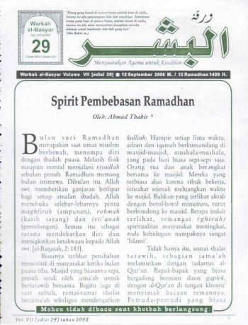 Ramadhan kali ini semoga menjadi ajang introspeksi (muhasabah) semua pihak, untuk menghadirkan semangat dan gerakan pembebasan. Terbebas dari godaan syaithan dan sikap pragmatisme yang mengganggu kekhusyu’an ibadah, ataupun syaithan yang berupa kedzaliman, penindasan, pemiskinan dan lain sebagainya, yang bertentangan dengan harkat dan martabat kemanusiaan.[] | |||