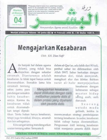 |} | |}Ada banyak hal dalam agama (Islam), yang tidak bisa diajarkan dengan sekedar ceramah. Diantaranya adalah kesabaran. Ia tidak tepat hanya untuk diceramahkan. Semakin lama kita ceramah tentang sabar, justru para pendengar semakin habis kesabar-annya. Karena itu kesabaran tidak untuk diceramah-kan tetapi diprak-tikan. Tentu bukan hanya kesabaran, tetapi juga tawakkal, khusyu, amanah dan lain sebagainya. | ||