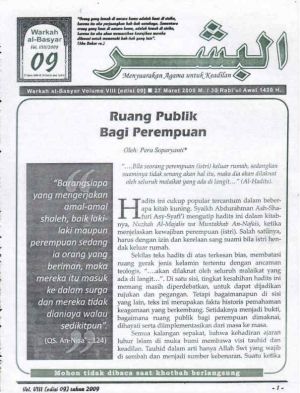 |} | |}{{Infobox book|image=Berkas:AlBasyar Vol8 (Cov9).jpg|italic title=Warkah Al-Basyar Volume VIII|title_orig=Warkah Al-Basyar Volume VIII|notes=[https://drive.google.com/file/d/161Z2na8SU97VAVehR7Hr6HTFCKafM3iW/view?usp=drive_link Download Al-Basyar Vol.8 Tahun 2009; Edisi 9]}}Semua kalangan sepakat, bahwa kehadiran ajaran luhur Islam di muka bumi membawa visi [[tauhid]] dan keadilan. Tauhid dalam arti hanya Allah Swt yang wajib di sembah dan menjadi sumber kebenaran. Suatu ketika Nabi pernah diprotes oleh sekelompok perempuan yang merasa kurang mendapat ruang untuk banyak belajar kepada Nabi. Nabi pun meresponnya, agar mereka segera berkumpul, untuk berdiskusi dengannya tentang persoalan-persoalan yang mereka hadapi.<blockquote>“….Bila seorang perempuan (istri) keluar rumah, sedangkan suaminya tidak senang akan hal itu, maka dia akan dilaknat oleh seluruh malaikat yang ada di langit…” (Al-[[Hadits]]).</blockquote>Hadits ini cukup popular tercantum dalam beberapa kitab kuning. Syaikh Abdurahman Ash-Shafuri Asy-Syafi’i mengutip hadits ini dalam kitabnya, Nuzhah Al-Majalis wa Muntakhab An-Nafais, ketika menjelaskan kewajiban perempuan (istri). Salah satunya, harus dengan izin dan kerelaan sang suami bila istri hendak keluar rumah. | ||