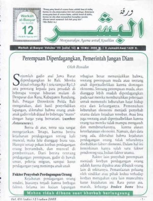 |} | |}{{Infobox book|image=Berkas:AlBasyar Vol7 (Cov12).jpg|italic title=Volume VII Tahun 2008; Edisi 12|title_orig=Volume VII Tahun 2008; Edisi 12|notes=[https://drive.google.com/file/d/13YveFxFzB7CFeAgJ5VQ-Q_JlcSpv-Cou/view?usp=drive_link Download Al-Basyar Vol.7 Tahun 2008; Edisi 12]}}Sejumlah gadis asal Jawa Barat diperdagangkan ke Bali. Mereka dijual seharga Rp. 1 juta sampai Rp. 1,5 juta perorang kepada para penadah di beberapa tempat hiburan malam di Denpasar dan Kuta, Kabupaten Badung, Bali. Petugas Ditreskrim Polda Bali mengatakan, dari hasil penyelidikan lapangan, diketahui bahwa orang anak-anak gadis telah dijual ke beberapa “mami” dengan harga yang bervariasi. (sumber: Antaranews). | ||