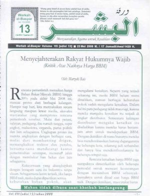|} | |}{{Infobox book|image=Berkas:AlBasyar Vol7 (Cov13).jpg|italic title=Volume VII Tahun 2008; Edisi 13|title_orig=Volume VII Tahun 2008; Edisi 13|notes=[https://drive.google.com/file/d/1X4TQQ0nn-qBX_-uKzEA1Juf-1Xy9YrQ9/view?usp=drive_link Download Al-Basyar Vol.7 Tahun 2008; Edisi 13]}}Rencana pemerintah menaikan harga Bahan Bakar Minyak (BBM) hingga 30% pada akhir Mei 2008 ini, menuai protes dari berbagai kalangan. Hampir tiap hari, kita menyaksikan secara langsung maupun lewat media, aksi-aksi masyarakat yang memprotes rencana pemerintah tersebut. Mulai dari petani, nelayan, pedagang, ibu rumah tangga, sopir angkot, mahasiswa, organda, partai politik dan lain sebagainya. | ||
