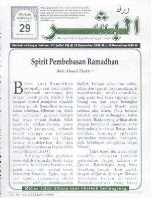 |} | |}{{Infobox book|image=Berkas:AlBasyar Vol7 (Cov29).jpg|italic title=Volume VII Tahun 2008; Edisi 29|title_orig=Volume VII Tahun 2008; Edisi 29|notes=[https://drive.google.com/file/d/1Ip06gzI6kE8vIBpiZB3ip58HttYE4KOw/view?usp=drive_link Download Al-Basyar Vol.7 Tahun 2008; Edisi 29]}}Bulan suci Ramadhan merupakan saat umat muslim berbenah, menempa diri dengan ibadah puasa. Melatih fisik maupun mental menjalani riyadlah sebulan penuh. Ramadhan memang bulan istimewa. Dibulan itu, Allah swt. memberikan ganjaran berlipat bagi setiap amalan ibadah. Allah membuka selebar-lebarnya pintu maghfirah (ampunan), rahmah (kasih sayang) dan isti’anah (pertolongan). Semua itu sebagai sarana mendekatkan diri dan menigkatkan ketakwaan kepada Allah swt. [al-Baqarah, 2: 183]. | ||