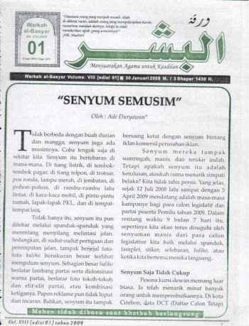 Senyum para calon legislatif yang kini marak itu, mudahan-mudahan bukanlah “senyum semusim”: senyum sesaat yang pada akhirnya berbuah kekecewaan. Kita berharap ketika berhasil duduk di Gedung Dewan, kelak mereka menjadi wakil-wakil rakyat yang amanah, tidak ingkar janji, dan betul-betul mau bekerja keras demi kepentingan, kesejahteraan, dan kemaslahatan kita bersama.Semoga.[ ]